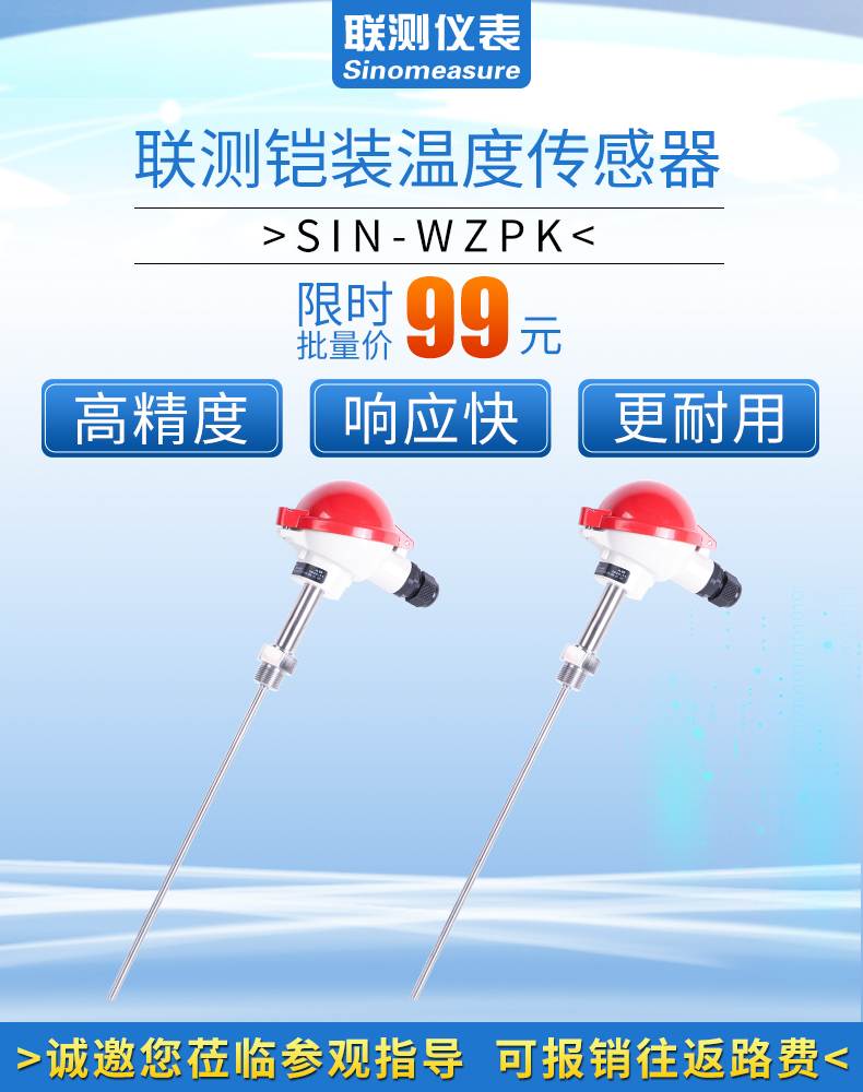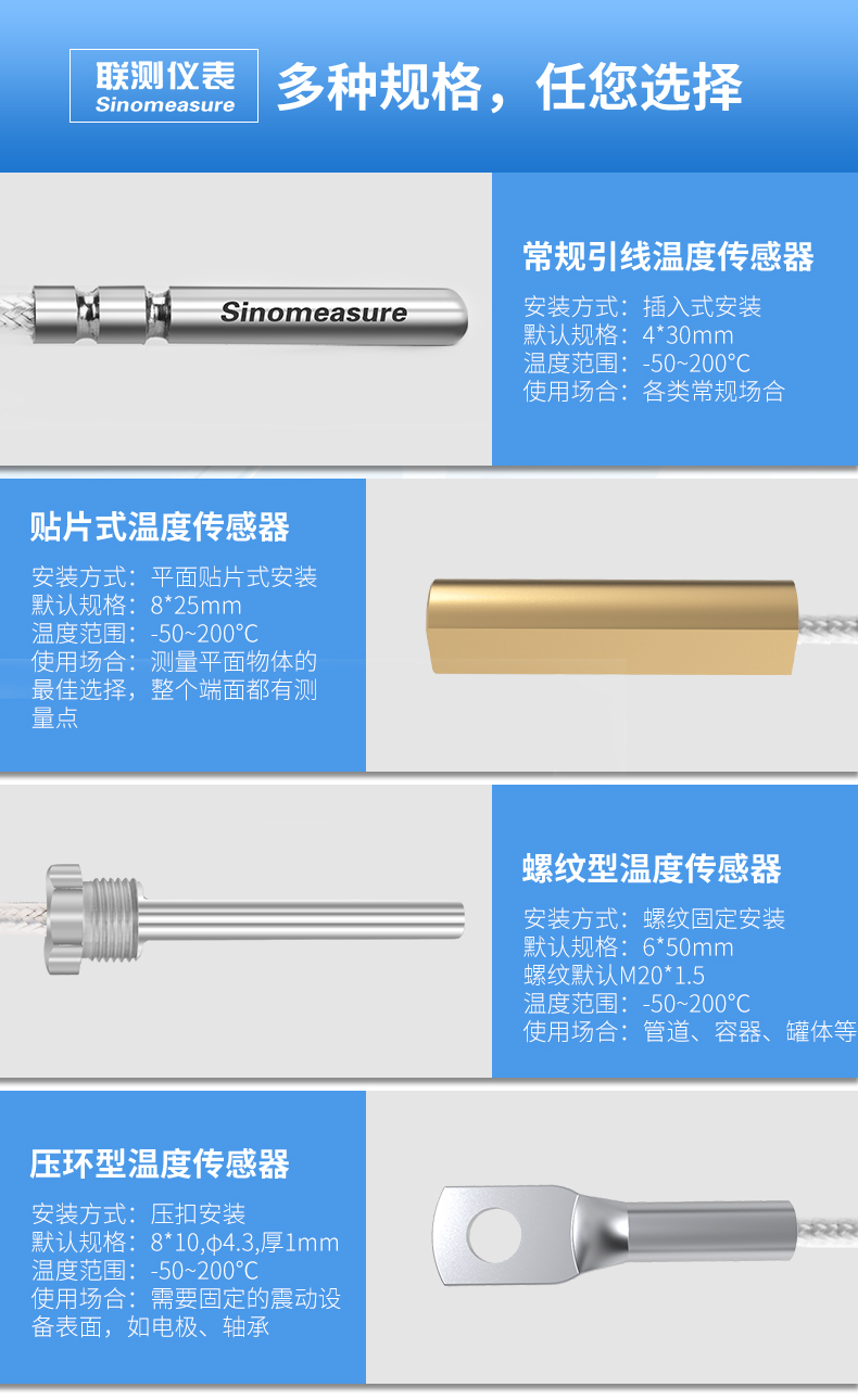 產品描述:聯測溫度傳感器可以直接測量各種生產過程中液體,蒸汽和氣體介質以及固體表面的溫度,通常和顯示儀表、記錄儀表等配套使用。