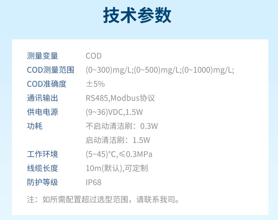 產品描述:COD 電極是一種用于測量水樣中化學需氧量的設備。電極無需試劑、無污染、更經濟環保??砷L期在線進行水質監測。傳感器內部集成一路濁度檢測光源、可對被測水體濁度干擾自動補償,傳感器帶有自動清潔刷裝置,即使長期監測依然具有極佳的穩定性。