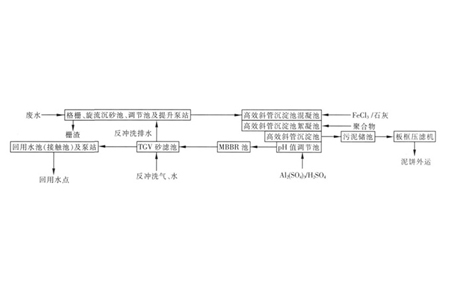 冶金廠廢水主要由各循環系統的排污水、及雨水組成,具有以下特點: 各循環系統定時排污,水量、水質變化大; 所含污染物以無機物為主,但含少量有機污染物,可生化性差; 總硬度、 總堿度較高; 含有少量浮油。為實現節能減排,現多 數冶金企業將綜合廢水收集在一起,處理后作為生產補水全部回用。