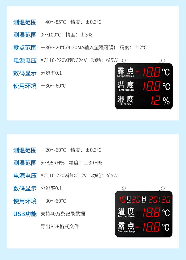 測(cè)量精度 濕度:±3%,溫度:±0.3℃,露點(diǎn):±2℃