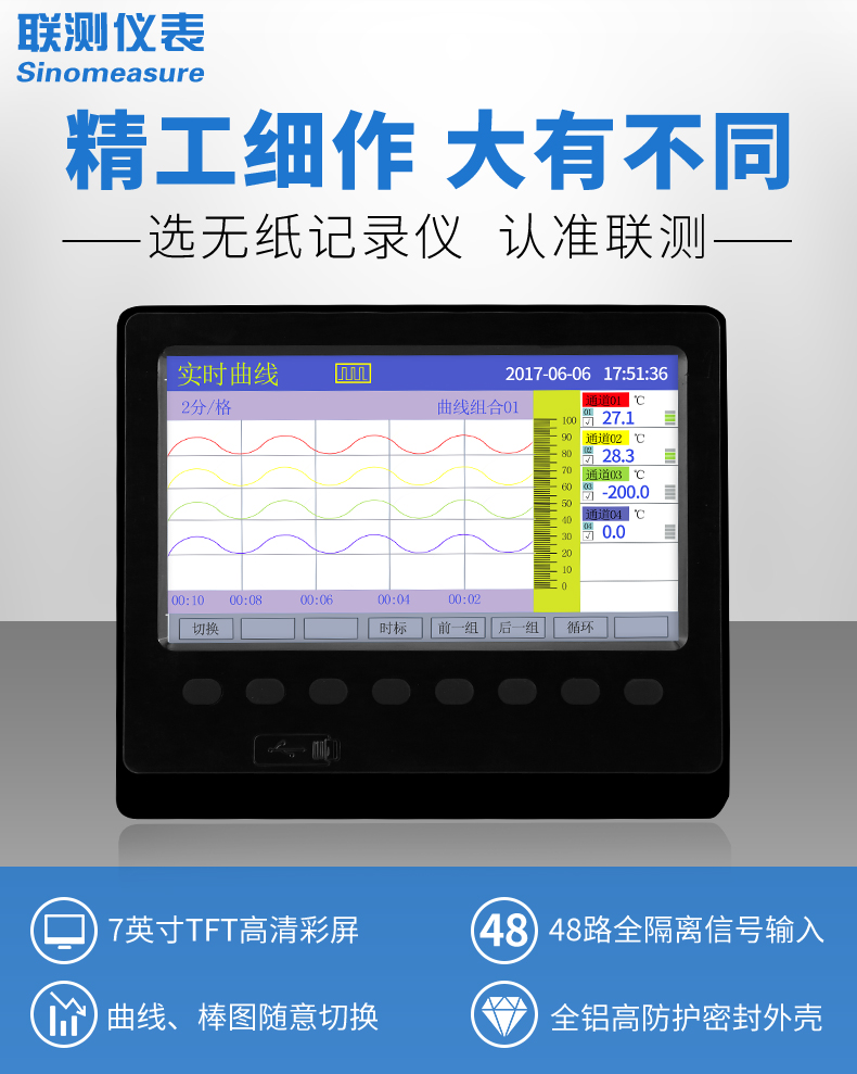 產(chǎn)品名稱:聯(lián)測_SIN-R6000C/4000C_1~48路可選_7英寸寬屏_彩色/藍(lán)屏_記錄溫度/壓力/電流/電壓/頻率多種參數(shù)