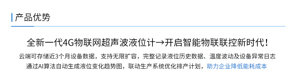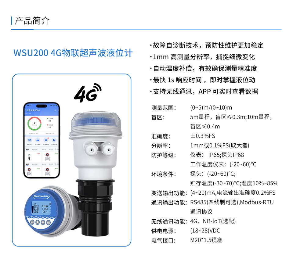 產(chǎn)品描述:WSU-200 4G物聯(lián)超聲波液位計具有高可靠性、高性價比、易安裝維護的液位/物位測量儀器,可廣泛用于各種液體和固體物料高度的測量。本產(chǎn)品可選配 NB-IoT 無線通訊功能,用戶可在儀表云平臺進行數(shù)據(jù)查看和遠程監(jiān)控。常見的應用工況,如市政、化工、儲運等工業(yè)環(huán)境中的河流、水池、儲罐等液位測量。咨詢熱線:400-185-1718